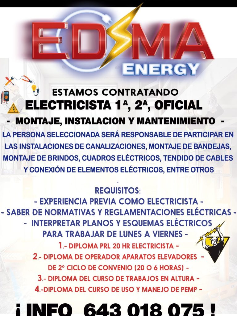 OFERTA DE EMPLEO – ELECTRICISTA INDUSTRIAL PARA OBRA